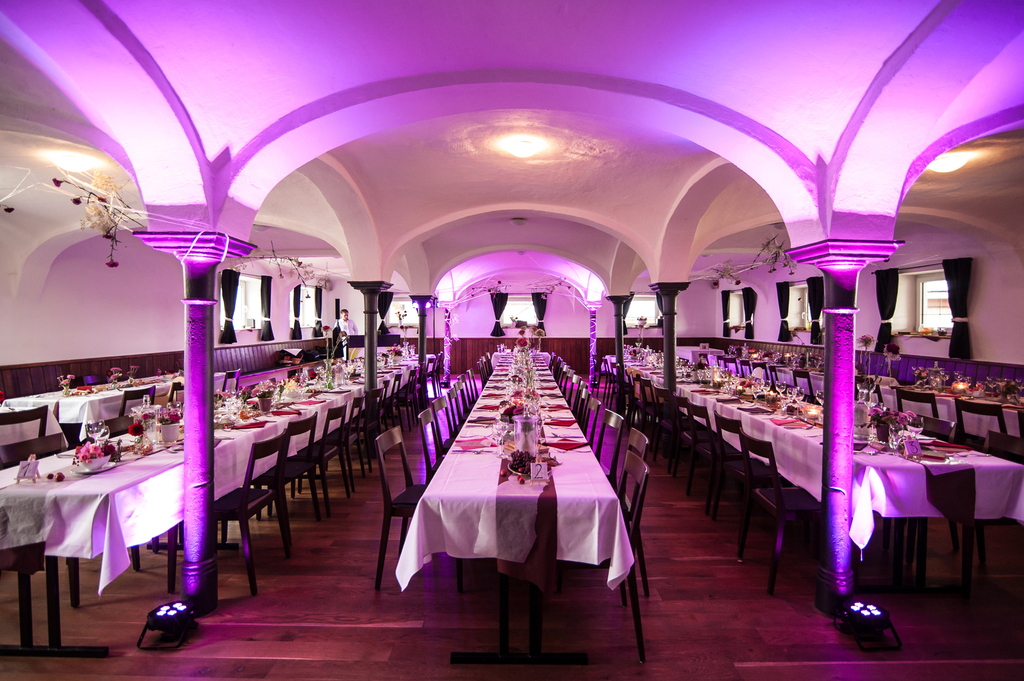 Neben der gemütlichen Gaststätte mit Nebenzimmern, Biergarten und Hotel wurde der ehemalige Kuhstall mit Kreuzgewölbe zu einem Festsaal für Feiern aller Art umgestaltet.