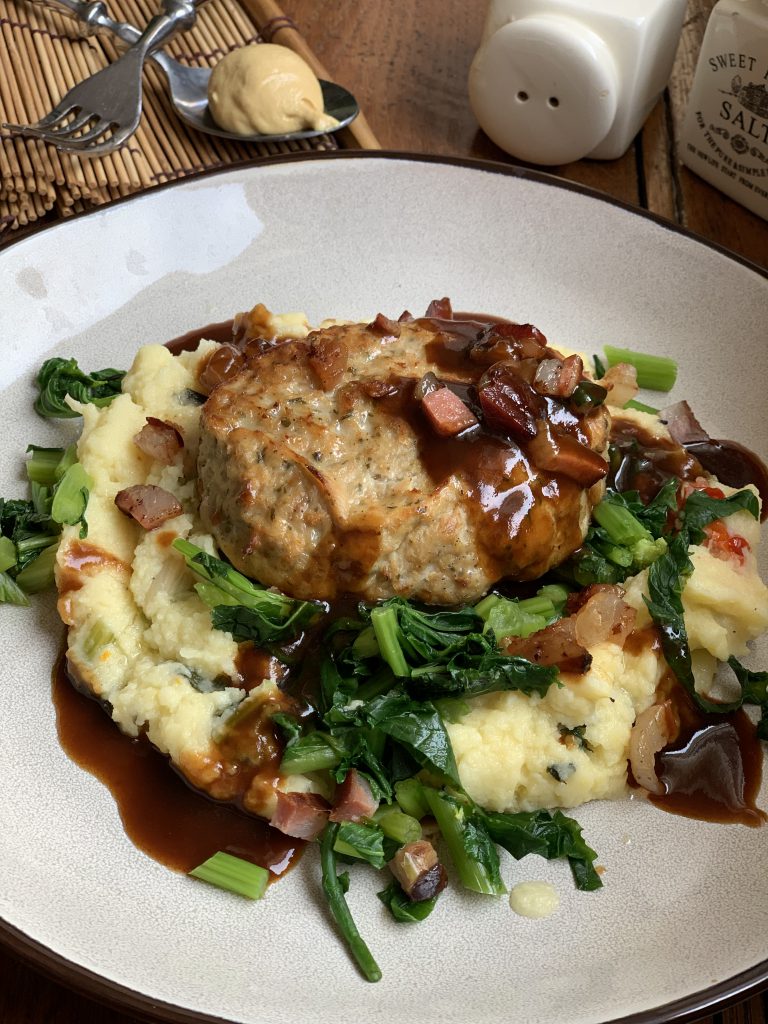 Hier die heutige Rezeptur für „Fleischkiachle mit Blattspinat und Sellerie-Erdnusspüree“: