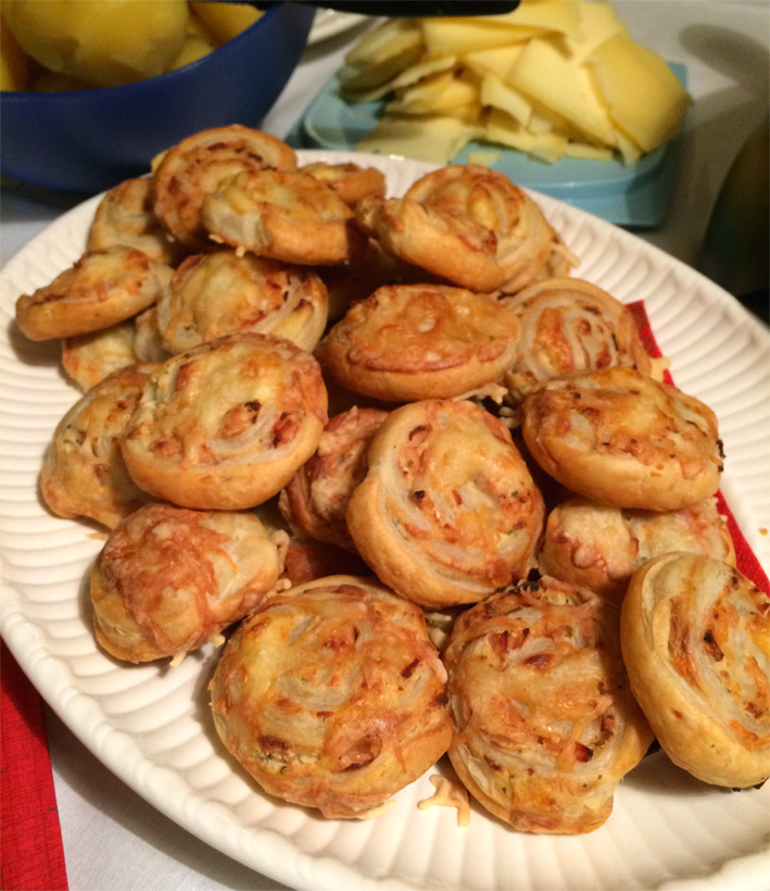 Den Schinken fein würfeln und auf den anderen Blätterteig streuen. Etwas geriebenen Käse oben drauf verteilen. Die Blätterteige aufrollen, straff in Klarsichtfolie wickeln und 30 Minuten ins Gefrierfach geben.