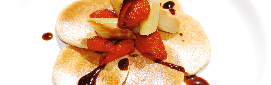 Ei, zerlassene Butter und Buttermilch verrühren. Mehl, Backpulver, Zucker, Salz und Zitronenabrieb mischen. Alles Zusammen zu einem glatten Teig verrühren. In einer beschichteten Pfanne etwas Butter zerlassen. Den Teig in kleinen Portionen hineingeben und von jeder Seite ca. 2-3 Minuten backen. Für das Schwarzriesling-Karamell den Zucker in einem kleinen Topf geben und karamellisieren lassen. Mit Schwarzriesling ablöschen und auf sirupartige Konsistenz reduzieren. Die Pfannkuchen mit dem Kompott und etwas Schwarzriesling-Karamell servieren.