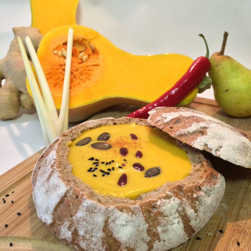 Den Kürbis und die Birnen schälen, entkernen und in Würfel schneiden. Die Schalotten, Knoblauchzehen und den Ingwer schälen und fein hacken. Dann Schalotten, Knoblauch, Ingwer und das sehr fein geschnittene Zitronengras (äußere Blätter entfernen) mit Öl in einem Topf anbraten. Den gewürfelten Kürbis und die Birnen dazu geben und mit Weißwein ablöschen. Fünf Minuten köcheln. Das Gemüse mit Brühe (mit Hühnerbrühe schmeckt`s würziger) aufgießen und zugedeckt ungefähr 25-30 Minuten weich kochen. Dann mit dem Pürierstab sehr fein mixen. Wer will kann die Suppe noch durch ein feinmaschiges Sieb passieren, damit diese noch glatter wird. Butter, Honig und die Gewürze dazugeben und weitere 5 Minuten ziehen lassen (Nicht kochen!).