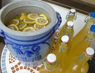 Einen großen Keramikbehälter oder Glastopf heiß ausspülen. Holunderblüten und Zitronenscheiben in das Behältnis geben. Die etwas abgekühlte Wasser-Zuckerlösung über die Blüten gießen.