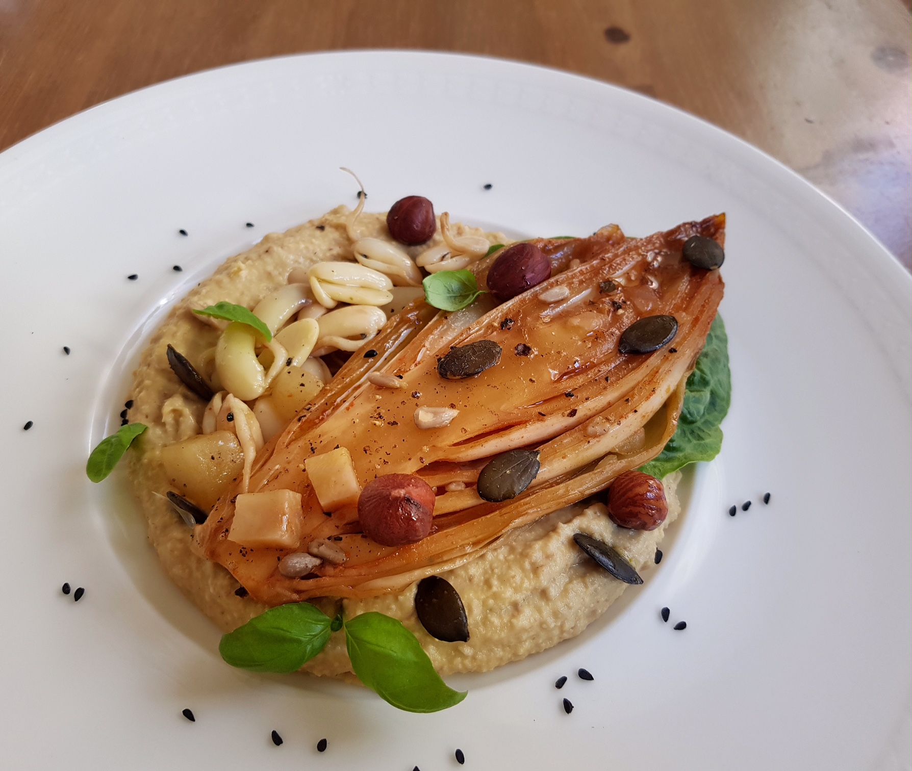 Zum Anrichten das Bohnenpüree auf Teller verteilen. Mittig eine Mulde drücken und darin die Bohnenkeimlinge und Birnenwürfel verteilen. Darauf ein Salatblatt und die Chicoree setzen und mit Nüssen und Basilikum bestreuen.