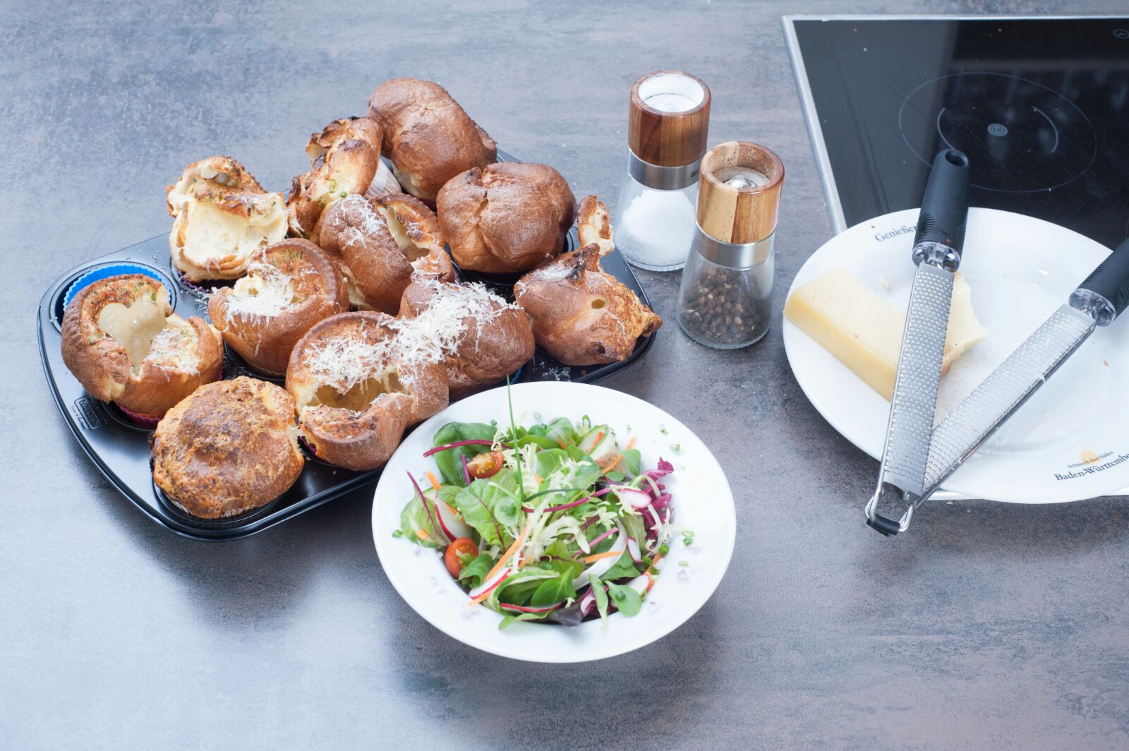 Die brisante Mixtur wird in Muffinformen gegossen. Diese wurden vorher noch zusätzlich mit hauchdünnen Speckscheiben und einem kleinen Stück Bergkäse ausgelegt. Kriminell gut! Und jetzt ab in den Ofen.
