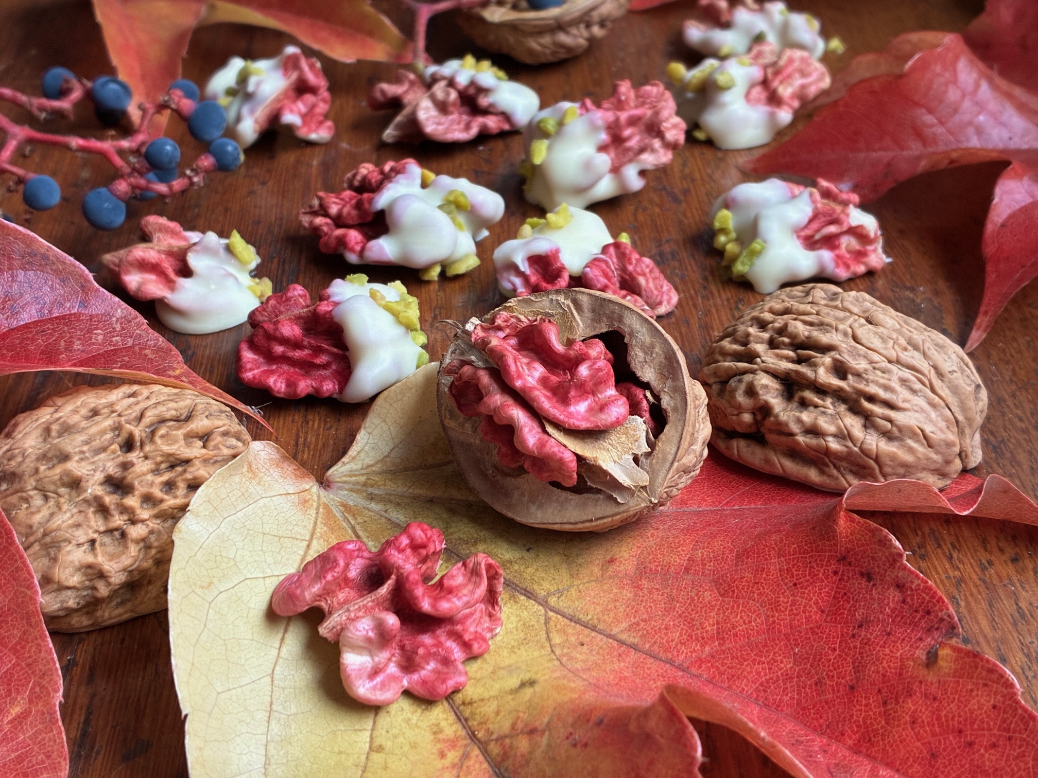 Rote Walnüsse stammen ursprünglich aus Kreuzungen mit Wildformen. Die Bäume und Schalen sehen meist aus wie bei gewöhnlichen Walnüssen, doch das Besondere ist das rote, dekorative Nussinnere. Sie sind selten und daher teurer, bedingt durch ihre Seltenheit, den aufwendigeren Anbau und die besondere optische und geschmackliche Qualität. Die leuchtenden Kerne sind ein Highlight für die Küche. Hier sind diese das Tüpfelchen auf dem i. Ein Augenschmaus als Dekor für Plätzchen, Pralinen und Kuchen. Ein Geheimtipp für Eilige: einfach die Walnusshälften in etwas flüssige Schokolade tauchen und auf Backpapier legen. Mit Pistazien bestreuen und erkalten lassen.